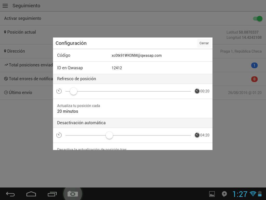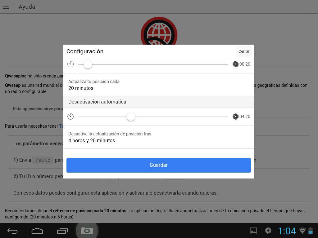 With the slipping controls you can choose to update your position between 5 minutes and 6 hours. We recommend 20 minutes. You must also choose the duration of the updates; It can be from 20 minutes to 12 hours. At the end of that period Qwasaploc stops sending updates and your location will be the last sent. When you're done, click the "Guardar" (Save) button.